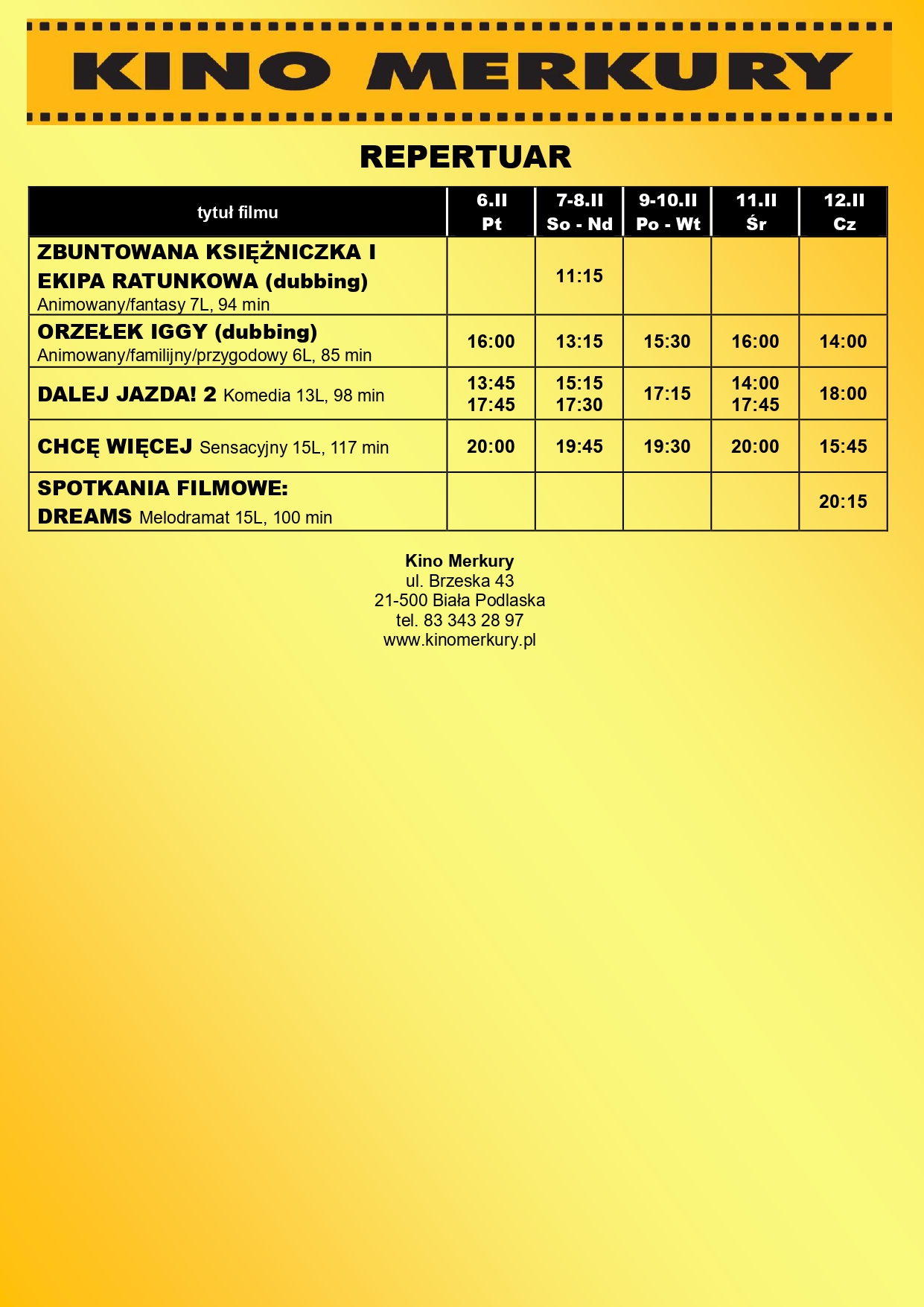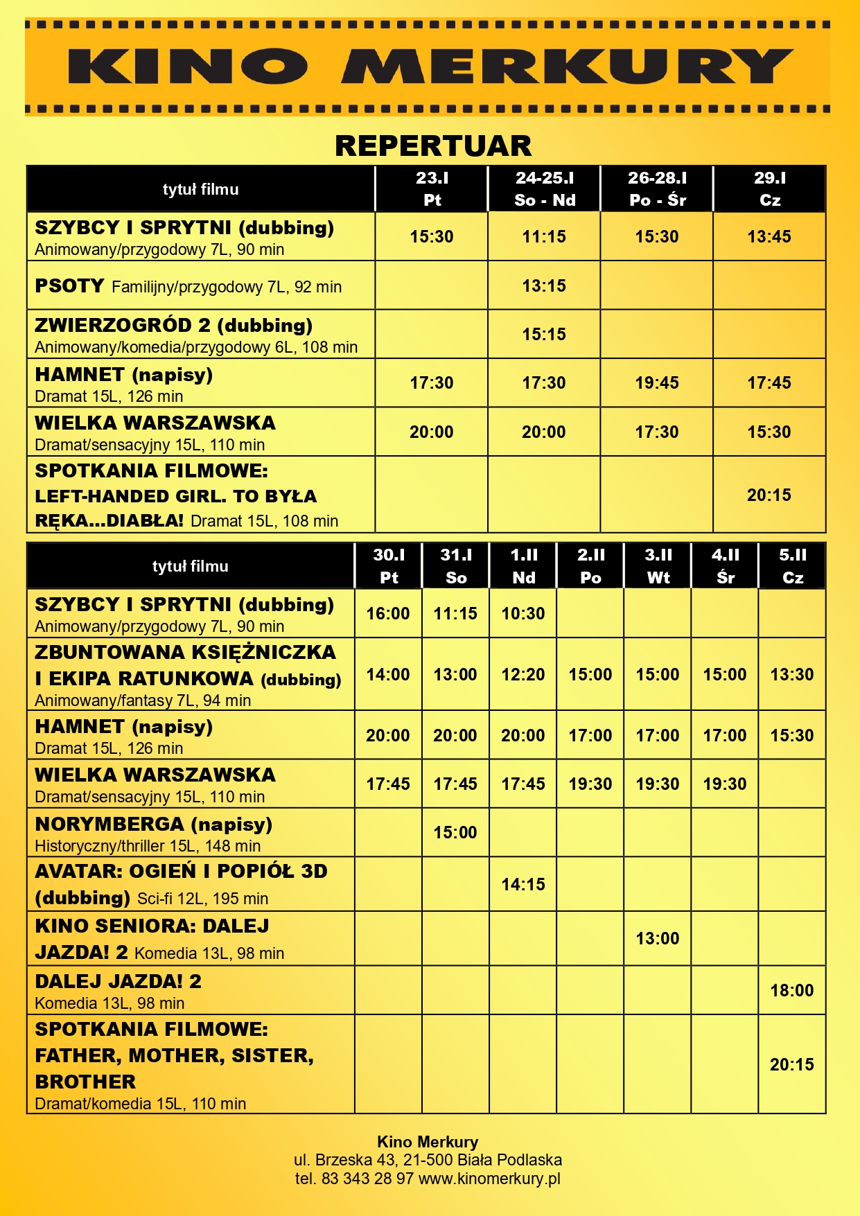Kino Merkury w Białej Podlaskiej zaprasza na bogaty repertuar filmowy, który będzie można oglądać od 23 stycznia do 12 lutego. W programie znalazły się zarówno propozycje familijne i animacje dla najmłodszych, jak i ambitne kino dramatyczne oraz seanse dla seniorów i spotkania filmowe.