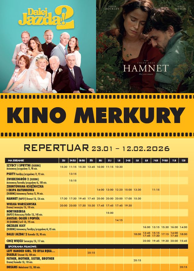 Na widzów czekają popularne filmy animowane z dubbingiem, m.in. „Szybcy i sprytni”, „Zwierzogród 2”, „Zbuntowana księżniczka i ekipa ratunkowa” czy „Orzełek Iggy”. Miłośnicy kina familijnego i przygodowego będą mogli również zobaczyć superprodukcję „Avatar: Ogień i popiół 3D”.W repertuarze nie zabraknie także mocniejszych, bardziej refleksyjnych tytułów. Na ekranie pojawią się m.in. dramat „Hamnet”, sensacyjna „Wielka Warszawska”, historyczna „Norymberga” oraz film „Chcę więcej”. Kontynuację popularnej komedii stanowi „Dalej jazda! 2”, prezentowana również w ramach cyklu Kino Seniora.