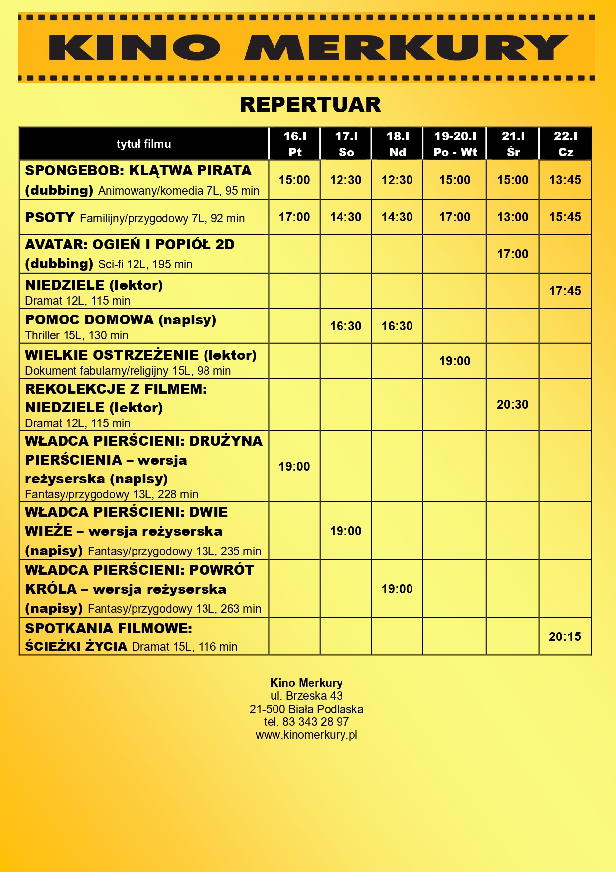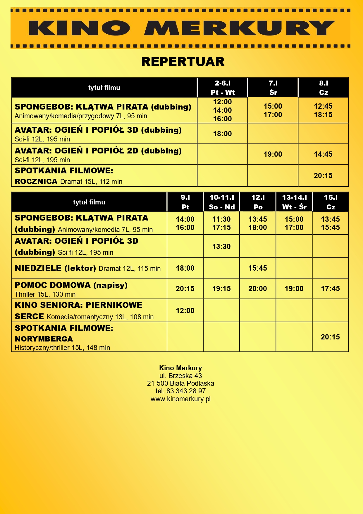 Seanse odbywają się w różnych godzinach, także popołudniowych i wieczornych. Szczegółowy repertuar poniżej i na stronie Kina Merkury.