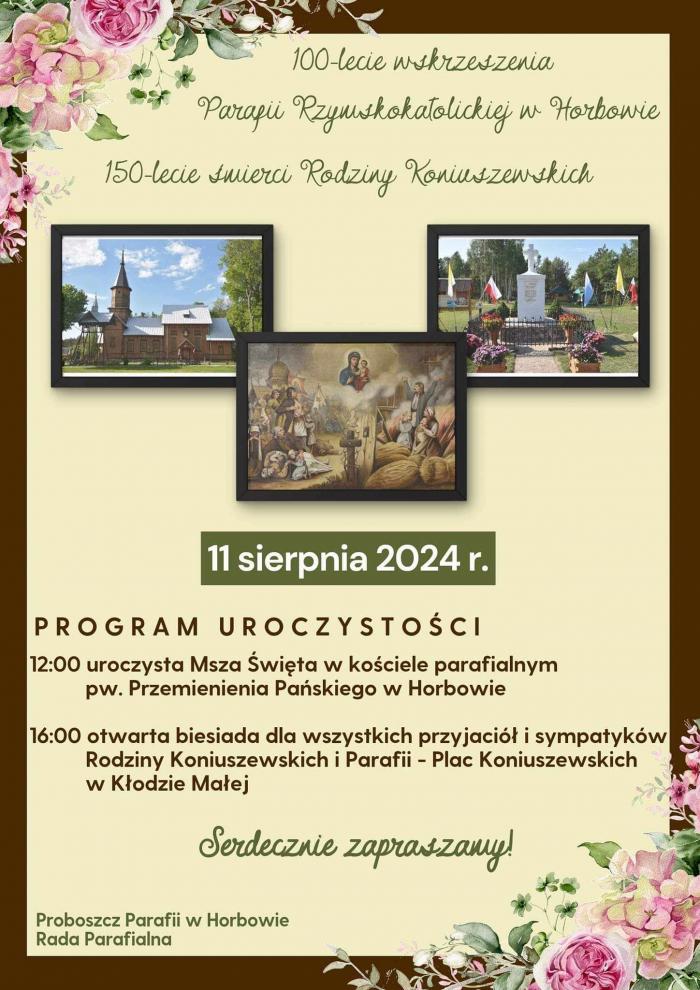 Obchody 100-lecia wskrzeszenia parafii w Horbowie oraz 150-lecia śmierci rodziny Koniuszewskich odbędą się w niedzielę, 11 sierpnia w Horbowie w Gminie Zalesie, w powiecie bialskim. Zainauguruje je o godzinie 12:00 uroczysta Msza Święta w kościele parafialnym pod wezwaniem Przemienienia Pańskiego w Horbowie.