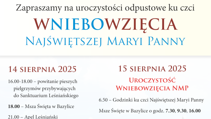 Kościół Diecezja siedlecka Leśna Podlaska Pt. 08.08.2025 21:30:02 Leśna Podlaska: Uroczystości odpustowe ku czci Wniebowzięcia Najświętszej Maryi Panny – program wydarzenia
