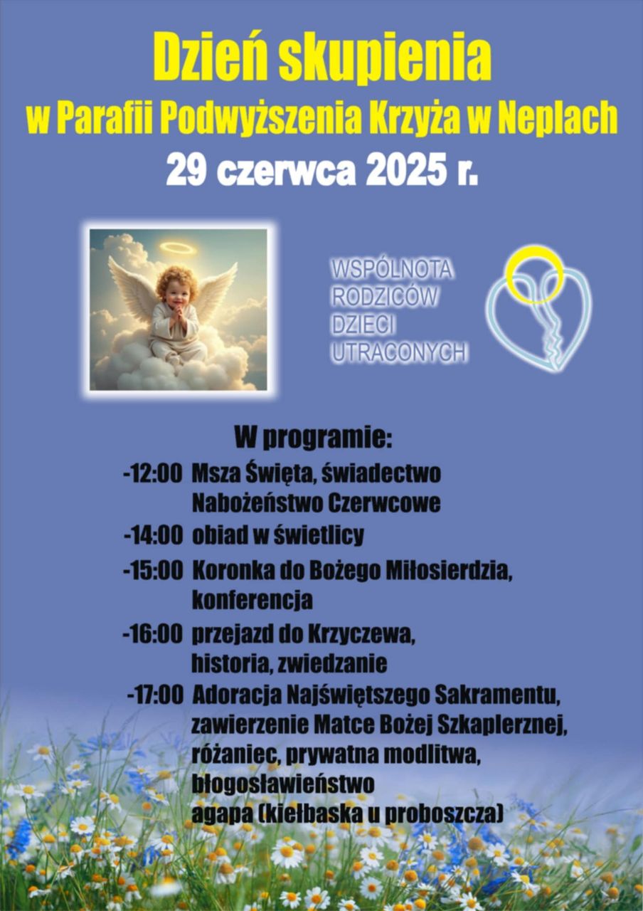 Uczestnicy Dnia Skupienia Wspólnot Rodziców Dzieci Utraconych spędzą ze sobą cały dzień. Spotkanie rozpoczną Mszą Świętą o godzinie 12:00 w kościele Podwyższenia Krzyża Świętego w Neplach. Będą też modlić się wspólnie Koronką do Bożego Miłosierdzia. Wysłuchają również konferencji. W planie jest także zwiedzanie Krzyczewa. Dzień zakończy wspólna adoracja Najświętszego Sakramentu i agapa. Nad wszystkim będzie czuwał ksiądz Daniel Sałasiński, proboszcz parafii w Neplach.Dzień Skupienia, który odbędzie się w niedzielę, 29 czerwca, zakończy rok formacyjnej działalności Wspólnot Rodziców Dzieci Utraconych. Kolejne spotkania zaplanowano na wrzesień. W Międzyrzecu Podlaskim, w parafii Świętego Mikołaja, członkowie wspólnoty spotkają się 14 września, a w Łukowie, w parafii Przemienienia Pańskiego, tydzień później – 21 września.