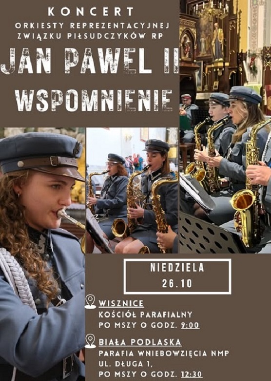 Orkiestra Reprezentacyjna Związku Piłsudczyków RP Okręgu Lubelskiego wystąpi w Wisznicach i w Białej Podlaskiej. Koncerty poświecone pamięci Papieża Polaka odbędą się już w najbliższą niedzielę, 26 października.