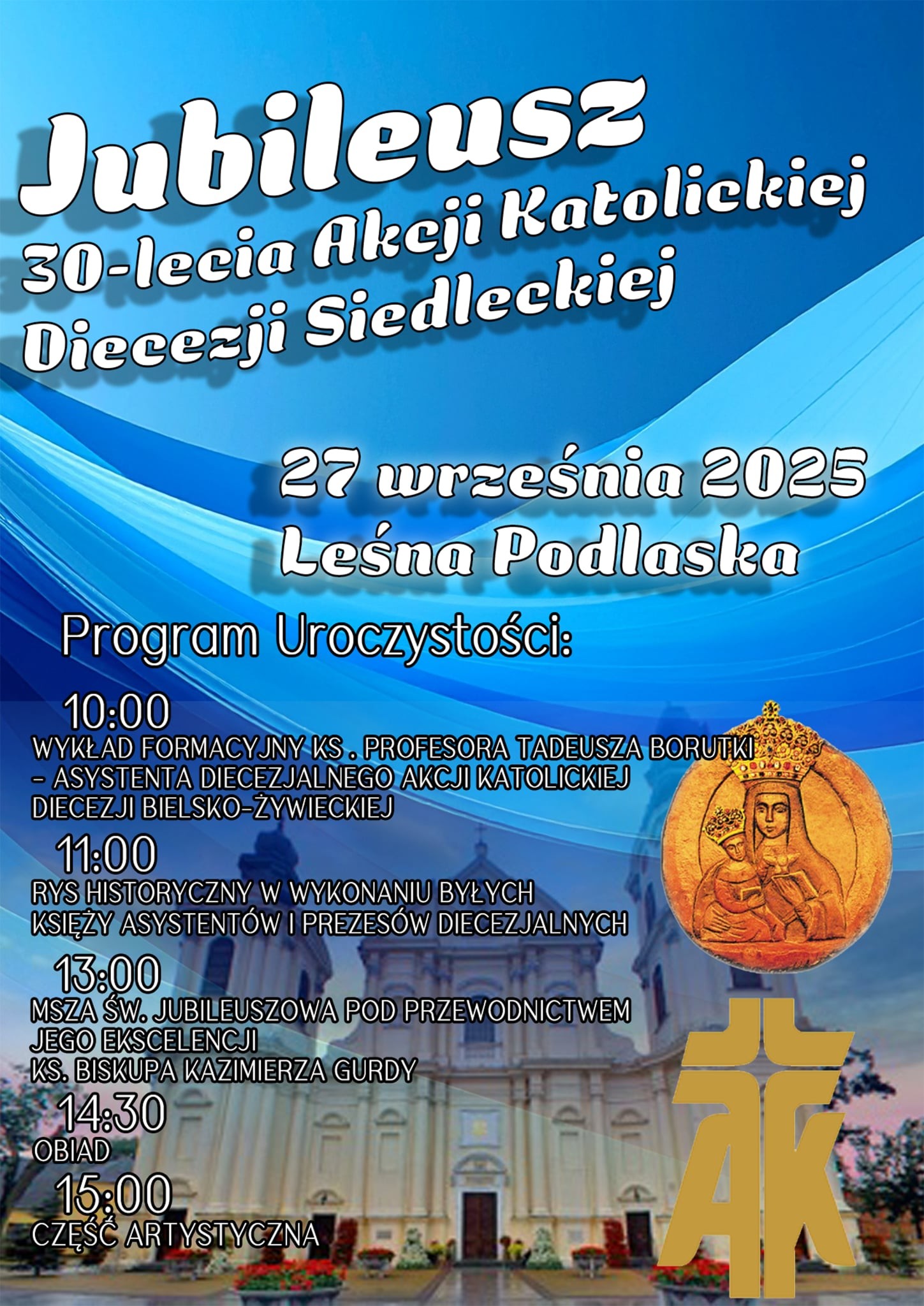 Akcja Katolicka Diecezji Siedleckiej obchodzi 30-lecie istnienia. Z tej okazji w najbliższą sobotę, 27 września, zaplanowano uroczystości jubileuszowe na terenie Sanktuarium Matki Bożej Leśniańskiej w Leśnej Podlaskiej.