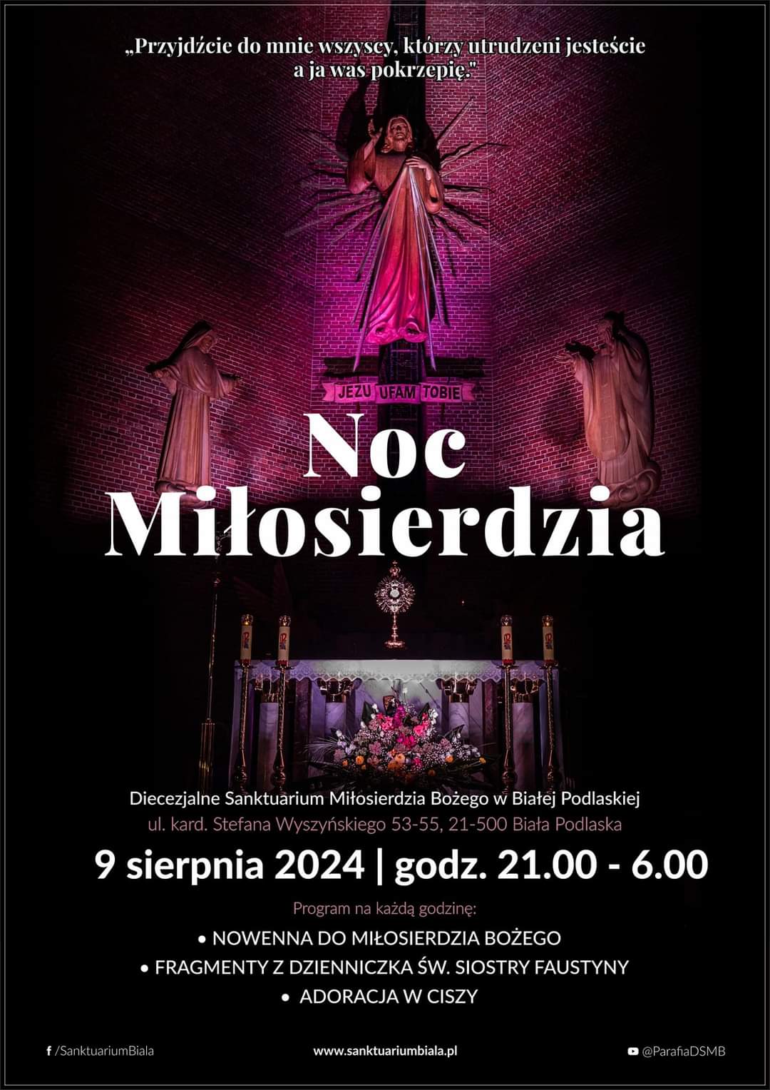 W nocy 9/10 sierpnia w Diecezjalnym Sanktuarium Miłosierdzia Bożego w Białej Podlaskiej organizowana jest nocna adoracja. W ramach Nocy Miłosierdzia w godzinach od 21.00 do 6.00 zaplanowano: Nowennę do Miłosierdzia Bożego, czytanie fragmentów Dzienniczka siostry Faustyny oraz adorację w ciszy.