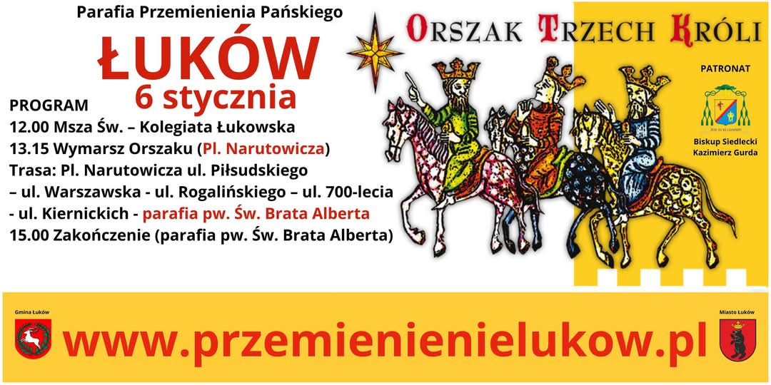 Orszak Trzech Króli rozpocznie się zaraz po zakończeniu Mszy Świętej, która o godzinie 12.00 zostanie odprawiona w łukowskiej Kolegiacie. Następnie uczestnicy Orszaku przejdą ulicami Piłsudskiego, Warszawską, Rogalińskiego, 700-lecia i Kiernickich do kościoła Świętego Brata Alberta. Do udziału we wspólnym kolędowaniu zaprasza Robert Madejek, koordynator wydarzenia:![]() |
