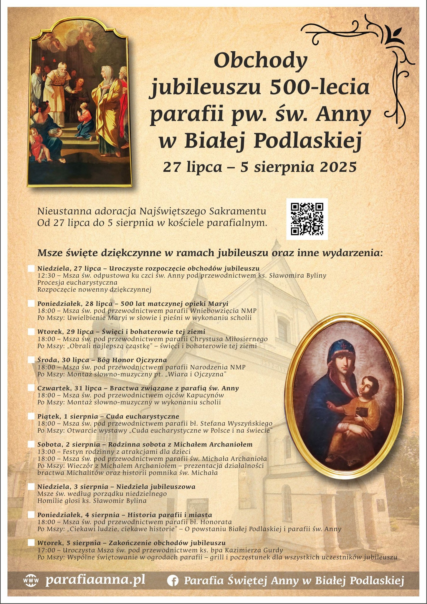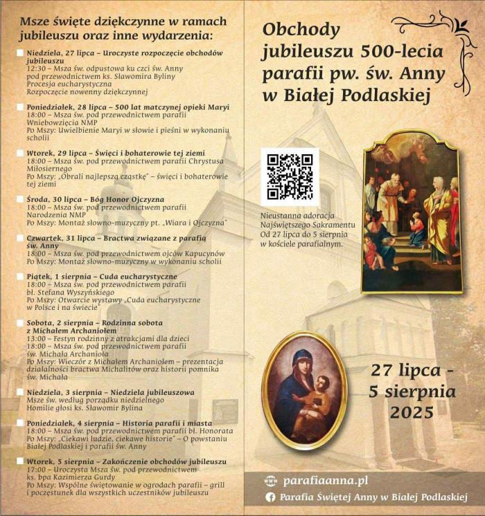 Parafia św. Anny w Białej Podlaskiej przygotowuje się do wyjątkowego wydarzenia – Jubileuszu 500-lecia swojego istnienia. Obchody potrwają od 27 lipca do 5 sierpnia i rozpoczną się uroczystą Mszą św. odpustową w najbliższą niedzielę, 27 lipca, o godz. 12:30. Liturgii będzie przewodniczył ks. Sławomir Bylina. Wierni, którzy tego dnia nawiedzą świątynię, będą mogli uzyskać odpust zupełny.