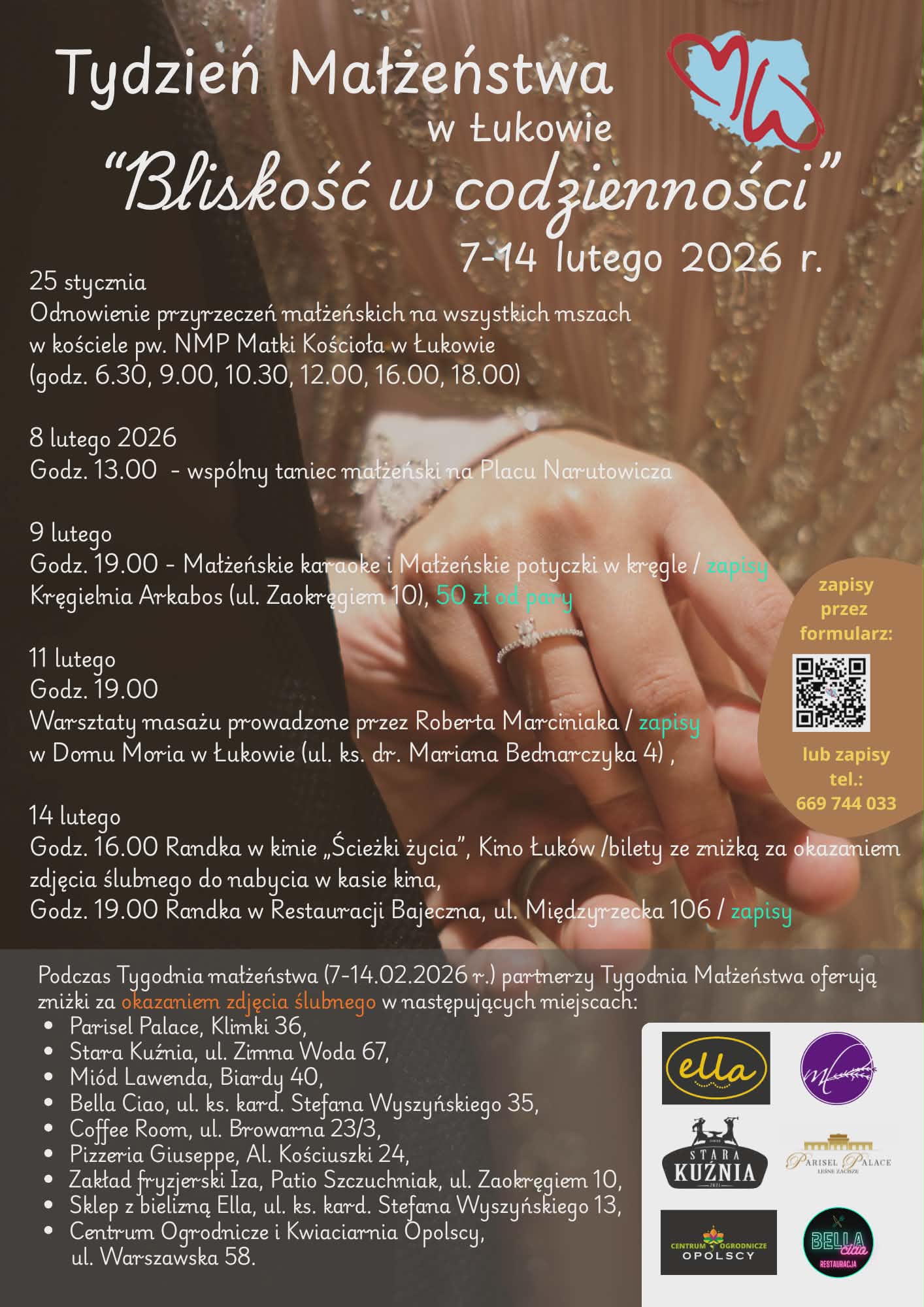Po raz kolejny w Łukowie odbędzie się „Tydzień Małżeństwa”. To ogólnopolskie wydarzenie, którego celem jest budowanie oraz pielęgnowanie relacji małżeńskich poprzez codzienne gesty, uważność i bycie razem.