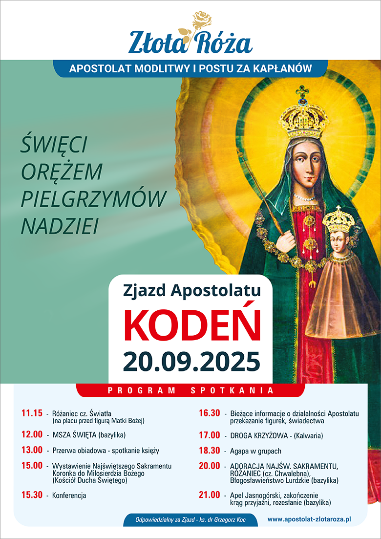 Zapraszamy wszystkie Wspólnoty Apostolatu „Złota Róża” i wszystkich, którzy kochają Kapłanów, na spotkanie w Kodniu, 20 września 2025 r. Gromadząc się u tronu Maryi, Matki Jedności i Matki Nadziei, będziemy prosić o światłe oczy naszych serc, abyśmy podążali drogą zbawienia, nie tracąc podczas duchowej wędrówki nadziei, ale umacniali swoją wiarę, zakorzeniając ją w Chrystusie i wpatrując się w świętych, dla których nadzieja była głównym orężem w trudnościach i świadectwem obecności Boga w ich życiu.”