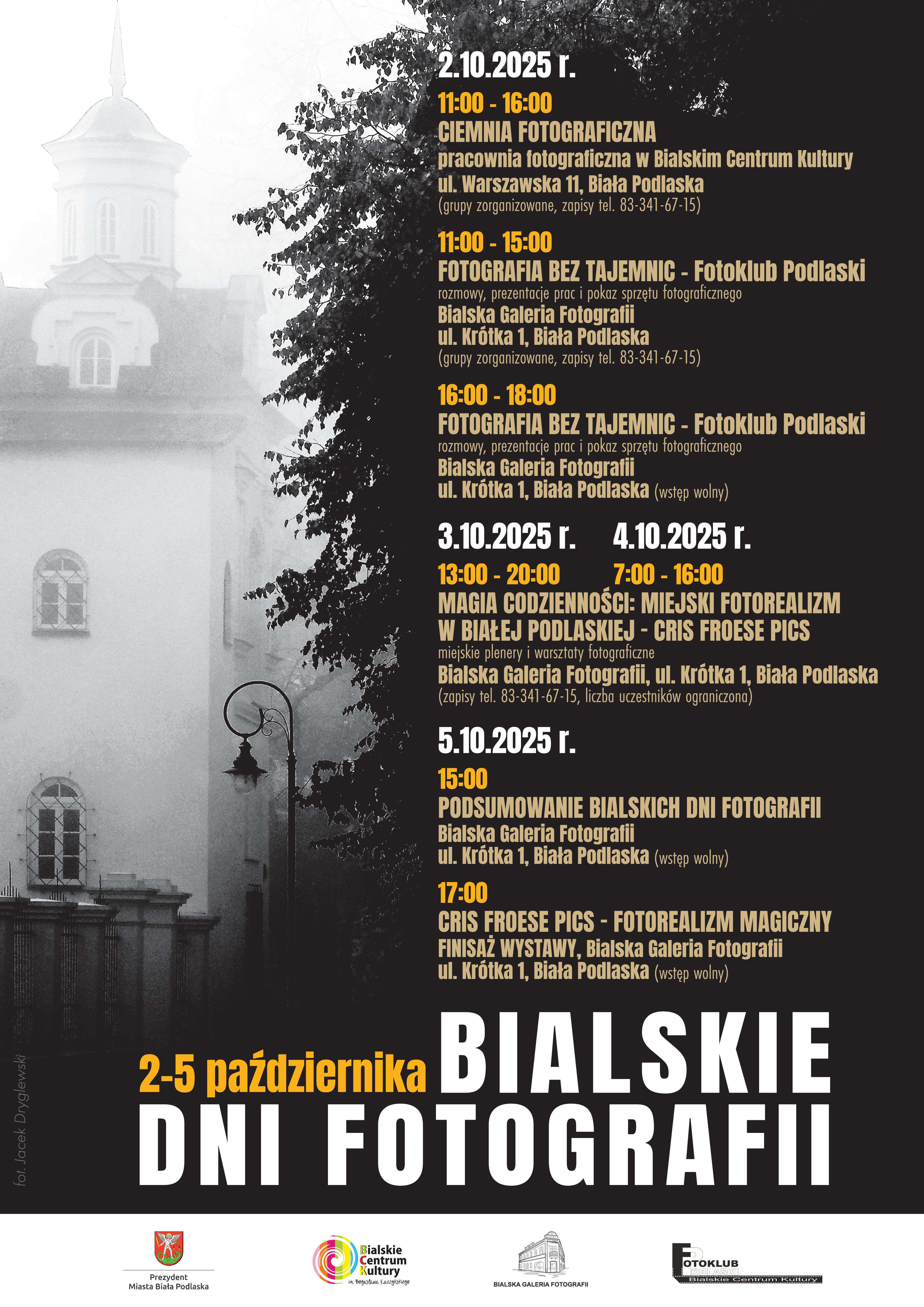 Program rozpoczyna się w czwartek, 2 października, warsztatami w ciemni fotograficznej, organizowanymi w Bialskim Centrum Kultury przy ul. Warszawskiej 11. Zajęcia skierowane są zarówno do osób indywidualnych, jak i zorganizowanych grup młodzieżowych (obowiązują zapisy). Tego samego dnia w Bialskiej Galerii Fotografii przy ul. Krótkiej 1 odbędzie się spotkanie z Fotoklubem Podlaskim – okazja do poznania lokalnych twórców, ich doświadczeń, inspiracji i pracy ze sprzętem fotograficznym. Wstęp wolny.W dniach 3–4 października (piątek–sobota) zaplanowano miejskie plenery fotograficzne z udziałem Crisa Froese. W piątkowe popołudnie uczestnicy poszukają światła i kadrów oddających jesienny klimat Białej Podlaskiej. Sobotni poranek rozpocznie się już o 7:00 próbą uchwycenia miejskiego krajobrazu o wschodzie słońca. Uczestnicy proszeni są o zabranie własnego sprzętu fotograficznego, ciepłego ubrania i prowiantu. Plenery są bezpłatne, jednak liczba miejsc jest ograniczona – obowiązują wcześniejsze zapisy.