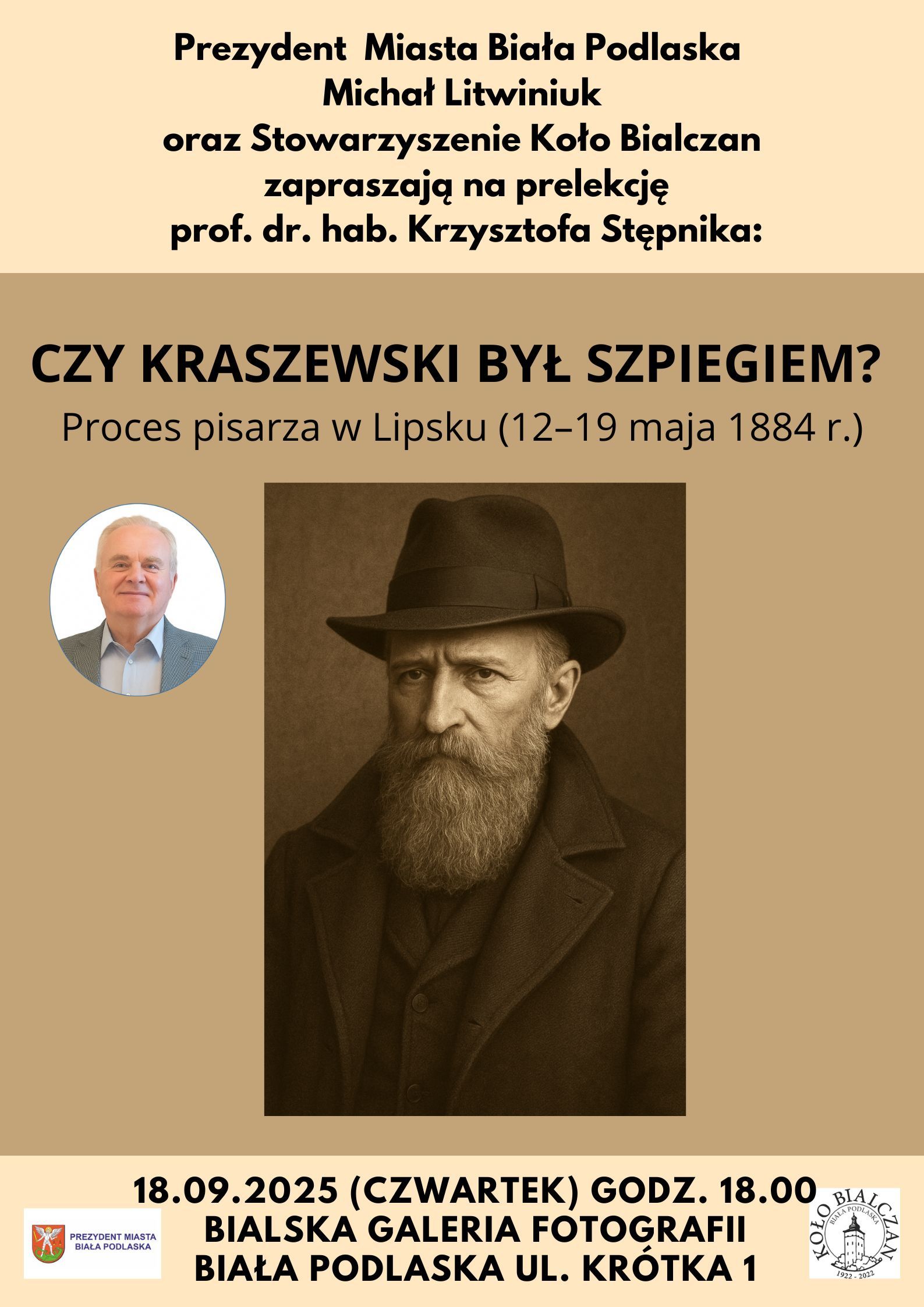 Prelekcję na ten temat wygłosi prof. dr hab. Krzysztof Stępnik – wybitny znawca literatury i kultury XIX wieku, związany m.in. z Uniwersytetem Marii Curie-Skłodowskiej. Spotkanie odbędzie się w czwartek, 18 września, o godz. 18:00 w Bialskiej Galerii Fotografii w Białej Podlaskiej, przy ul. Krótkiej 1.Wystąpienie zatytułowane „Czy Kraszewski był szpiegiem? Proces pisarza w Lipsku (12–19 maja 1884 r.)” przybliży kulisy oskarżenia autora „Starej Baśni” o działalność szpiegowską na rzecz Rosji. Profesor Stępnik zaprezentuje mniej znane fakty z życia pisarza, kontekst polityczny tamtego okresu oraz wpływ procesu na wizerunek Kraszewskiego w ówczesnej Europie.