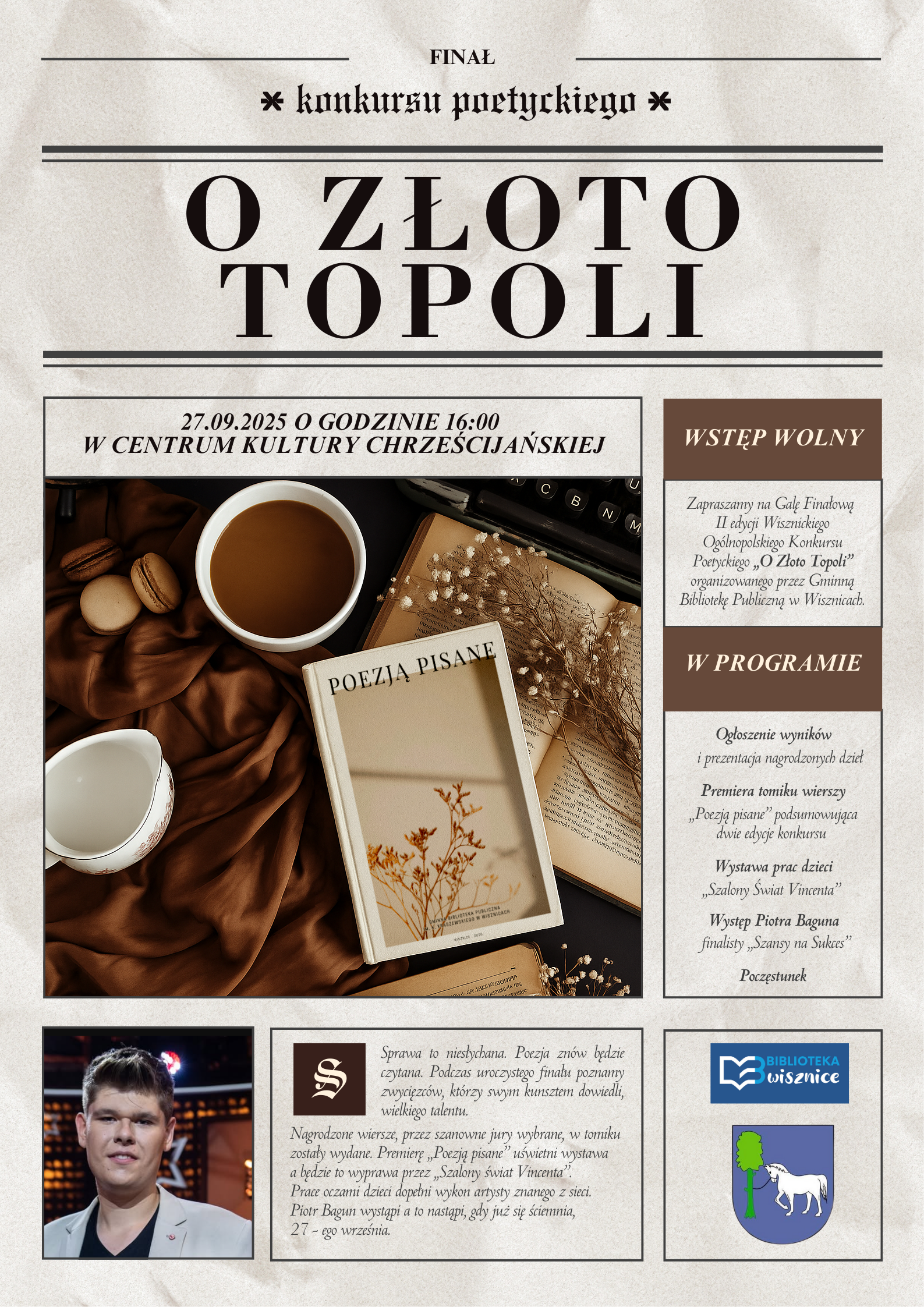 Finał 2. edycji Ogólnopolskiego Konkursu Poetyckiego „O Złoto Topoli”, organizowanego przez Gminną Bibliotekę Publiczną im. K. Kraszewskiego w Wisznicach, odbędzie się 27 września o godzinie 16:00 w Centrum Kultury Chrześcijańskiej w Wisznicach. W programie: premiera tomiku wierszy „Poezją pisane”, wystawa „Szalony świat Vincenta” oraz występ finalisty „Szansy na sukces” Piotra Baguna.