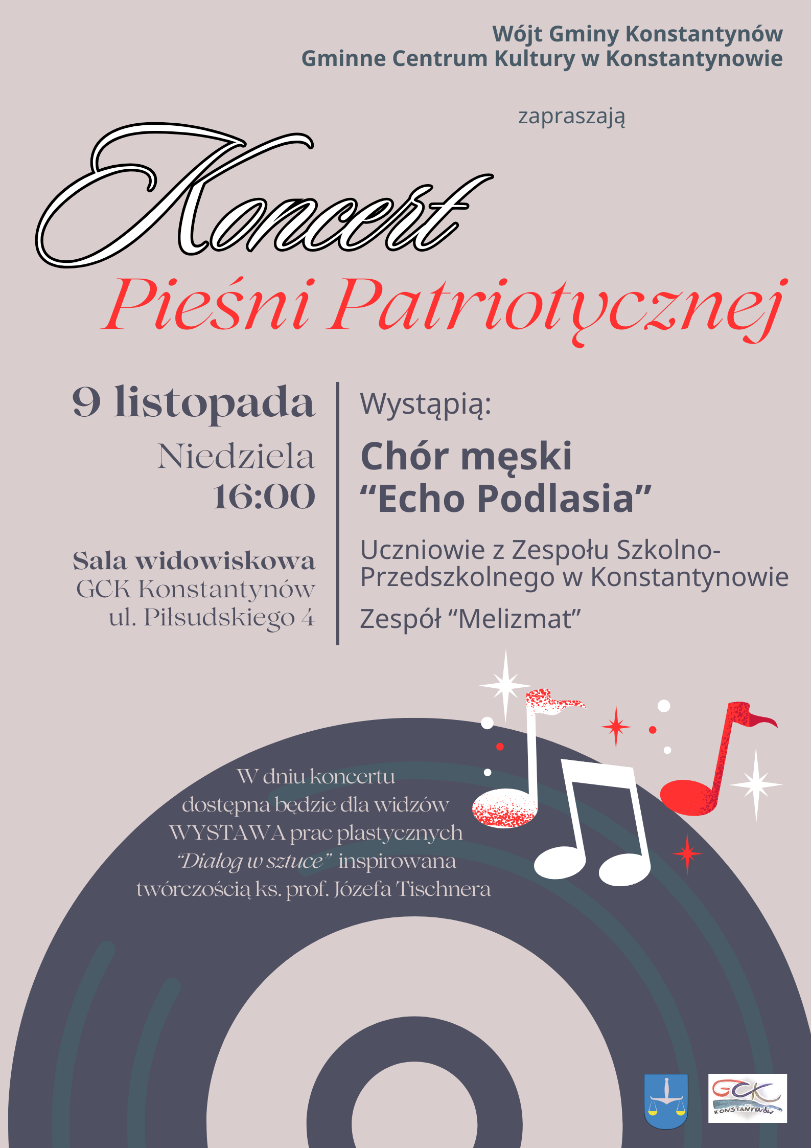 Pieśni patriotyczne w wykonaniu lokalnych artystów zabrzmią w sali widowiskowej Gminnego Centrum Kultury w Konstantynowie. Koncert Pieśni Patriotycznej odbędzie się 9 listopada o godzinie 16:00 i będzie okazją do wspólnego przeżywania muzyki nawiązującej do historii i tradycji narodowej.