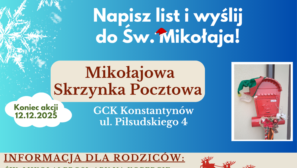 Gminne Centrum Kultury w Konstantynowie zorganizowało akcję, która jest skierowana do dzieci „Napisz list do Świętego Mikołaja!”.