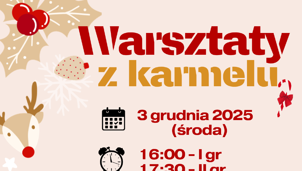 Zajęcia poprowadzą specjaliści z pracowni „Rękodzieło z Karmelu”, którzy zaprezentują techniki ręcznego tworzenia lizaków i cukierków. Uczestnicy będą mogli wykonać m.in. karmelowe bałwanki, tradycyjne laseczki w biało-czerwonych barwach oraz choinki ozdobione kolorowymi detalami – dokładnie takie, jakie przedstawiono na plakacie wydarzenia.