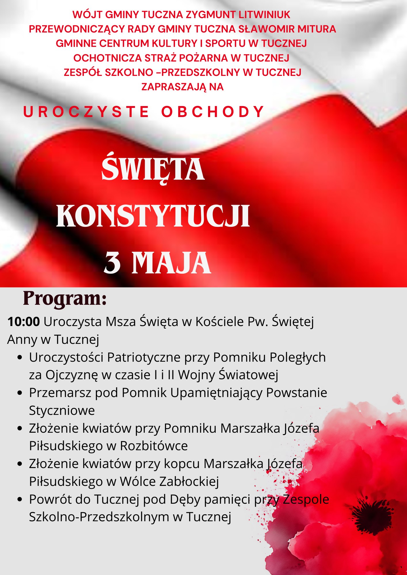 Gmina Tuczna zaprasza mieszkańców do udziału w obchodach Święta Narodowego Trzeciego Maja. Uroczystości rozpoczną się o godz. 10:00 Mszą Świętą w kościele pw. Świętej Anny w Tucznej, będącą symbolicznym początkiem wspólnego świętowania i wyrazem wdzięczności za wolność oraz tych, którzy o nią walczyli.