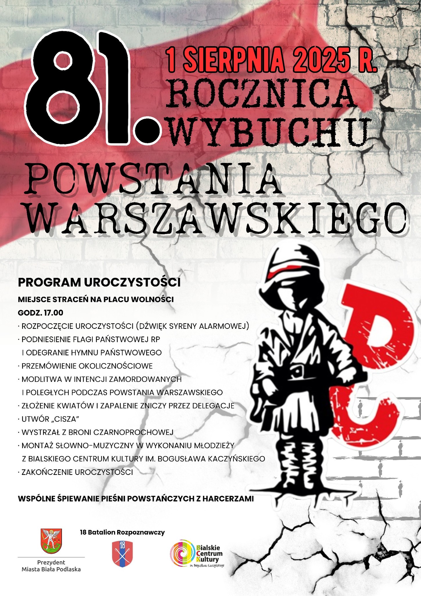 Wspólna inicjatywa Prezydenta Michała Litwiniuka, Bialskiego Centrum Kultury oraz 18 Dywizji Zmechanizowanej ma na celu oddanie hołdu uczestnikom powstańczego zrywu z 1944 roku. W godzinie „W” zatrzyma się ruch, by symbolicznie upamiętnić tych, którzy 81 lat temu walczyli o niepodległość naszej Ojczyzny.Powstanie Warszawskie było jednym z najważniejszych i najbardziej dramatycznych momentów w historii XX-wiecznej Polski. Trwało 63 dni i pochłonęło tysiące istnień ludzkich – zarówno żołnierzy, jak i cywilów.
