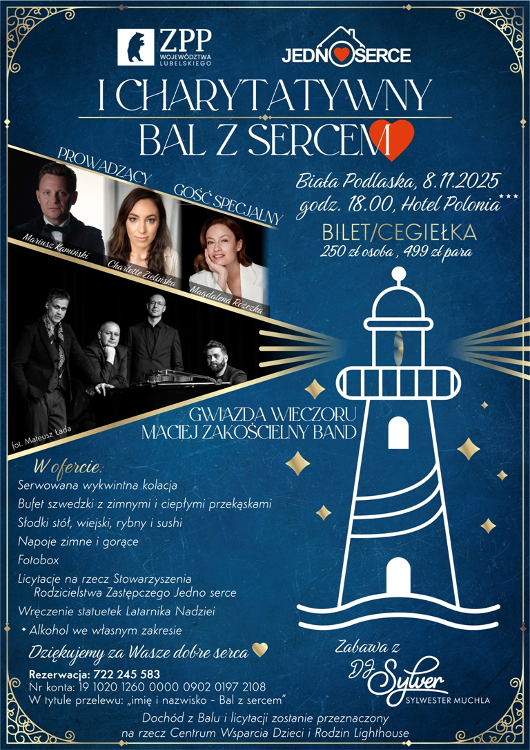 „Bal z Sercem” w Grabanowie to wyjątkowy wieczór, który łączy elegancję, muzykę i dobrą zabawę z pomocą potrzebującym. 8 listopada w Hotelu Polonia spotkają się przedstawiciele świata biznesu, kultury i lokalnej społeczności, by wspólnie wesprzeć dzieci i rodziny zastępcze oraz Centrum Wsparcia Dzieci i Rodzin „Lighthouse – Latarnia Nadziei” w Białej Podlaskiej.
