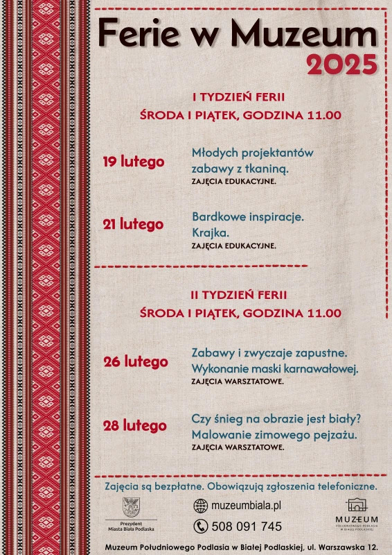 W poniedziałek, 17 lutego, rozpoczęły się ferie zimowe w województwie lubelskim. Ciekawe propozycje na twórcze spędzenie wolnego czasu ma dla dzieci i młodzieży Muzeum Południowego Podlasia w Białej Podlaskiej. Zajęcia edukacyjne i warsztatowe są bezpłatne. Obowiązują zapisy.