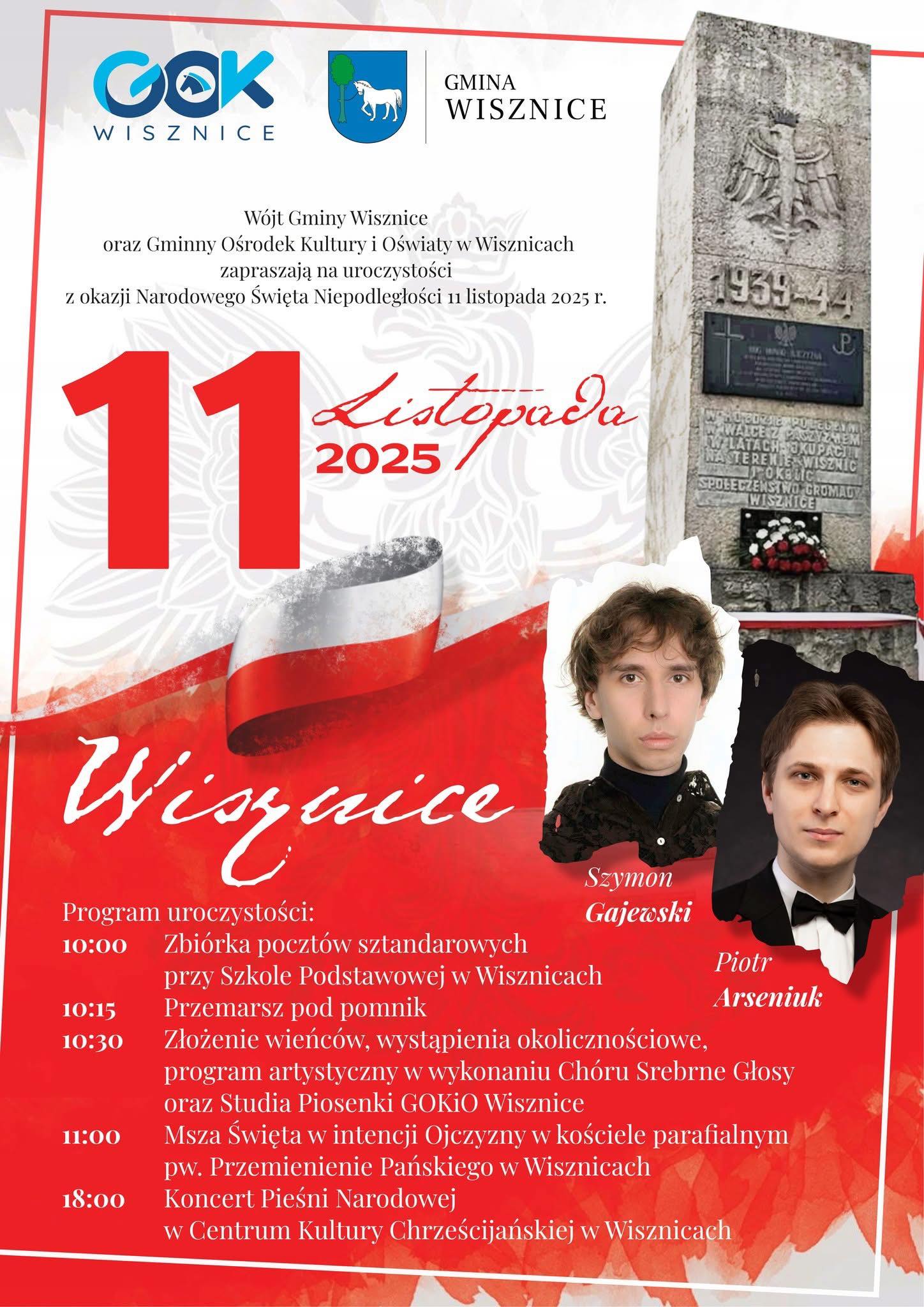 Obchody w parku przy pomniku w centrum Wisznic rozpoczną się o godz. 10:00 zbiórką pocztów sztandarowych przy Szkole Podstawowej. O godz. 10:15 nastąpi uroczysty przemarsz pod pomnik, a o 10:30 – złożenie wieńców, wystąpienia okolicznościowe i program artystyczny w wykonaniu Chóru „Srebrne Głosy” oraz Studia Piosenki GOKiO Wisznice. O godz. 11:00 odprawiona zostanie Msza św. w intencji Ojczyzny, a wieczorem o godz. 18:00 w Centrum Kultury Chrześcijańskiej odbędzie się koncert pieśni patriotycznej w wykonaniu Szymona Gajewskiego i Piotra Arseniuka.