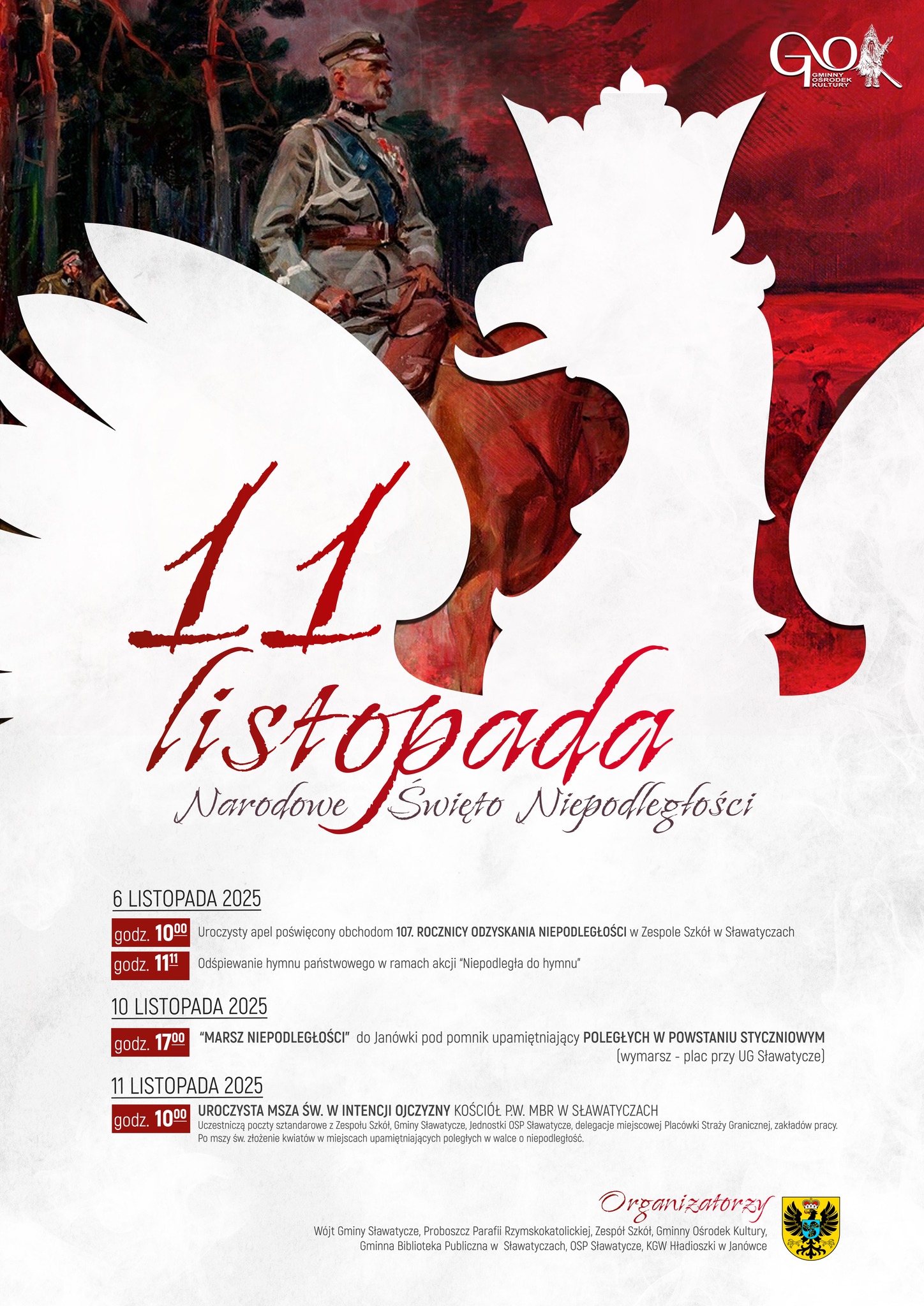 Gminne Centrum Kultury w Koroszczynie zaprasza mieszkańców i gości na widowisko patriotyczne pt. „Od Bolesława Chrobrego do Józefa Piłsudskiego”, wręczenie nagród w konkursie plastycznym oraz składanie kwiatów pod Pomnikiem Niepodległości i Nieznanego Żołnierza. Część artystyczna rozpocznie się o godz. 15:00 w Gminnym Centrum Kultury, natomiast o godz. 17:00 odbędzie się część oficjalna przy pomniku.