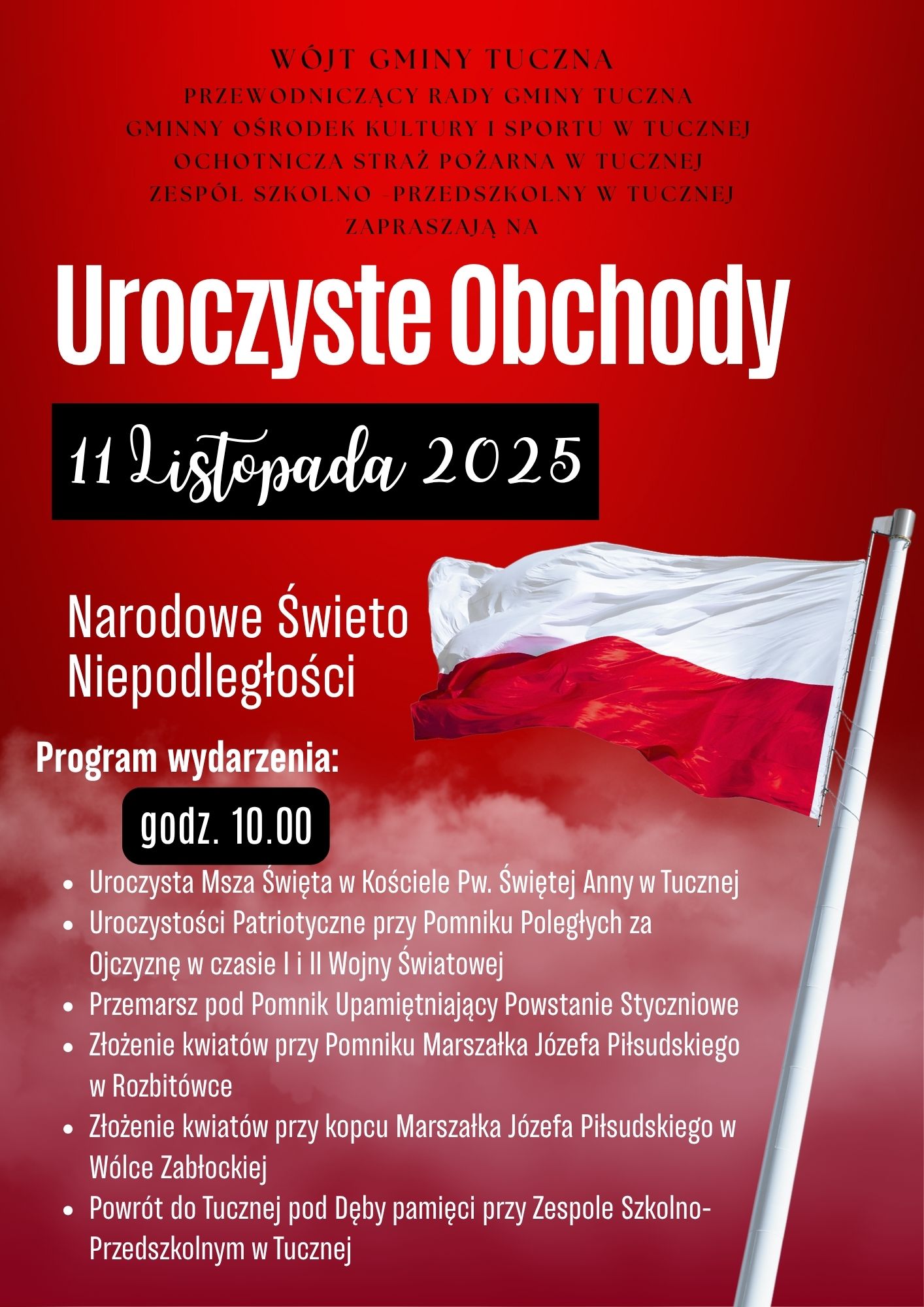 Uroczystości rozpoczną się o godz. 10:00 Mszą św. w Kościele p.w. Świętej Anny w Tucznej. Następnie zaplanowano przemarsz pod Pomnik Poległych za Ojczyznę w czasie I i II wojny światowej, złożenie kwiatów przy pomnikach upamiętniających Marszałka Józefa Piłsudskiego w Rozbitówce i Wólce Zabłockiej oraz pod Dębami Pamięci przy Zespole Szkolno-Przedszkolnym w Tucznej.