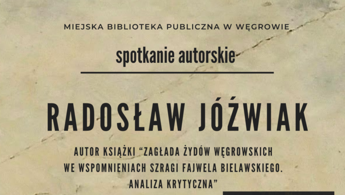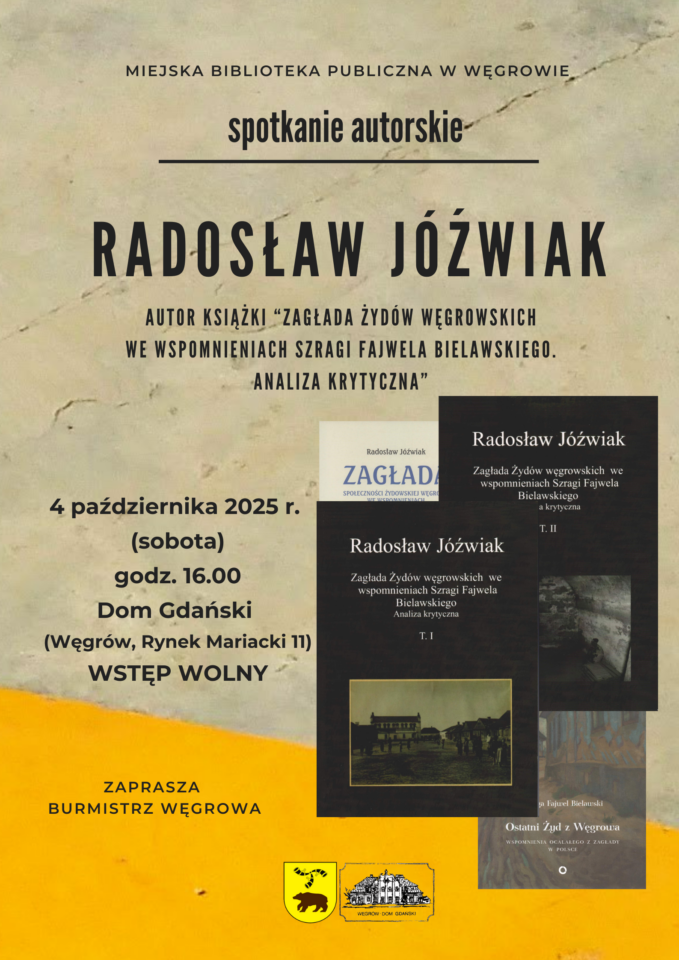 Miejska Biblioteka w Węgrowie zaprasza w sobotę, 4 października, na spotkanie z Radosławem Jóźwiakiem. Lokalny historyk zaprezentuje swoją książkę „Zagłada Żydów węgrowskich we wspomnieniach Szragi Fajwela Bielawskiego. Analiza krytyczna".
