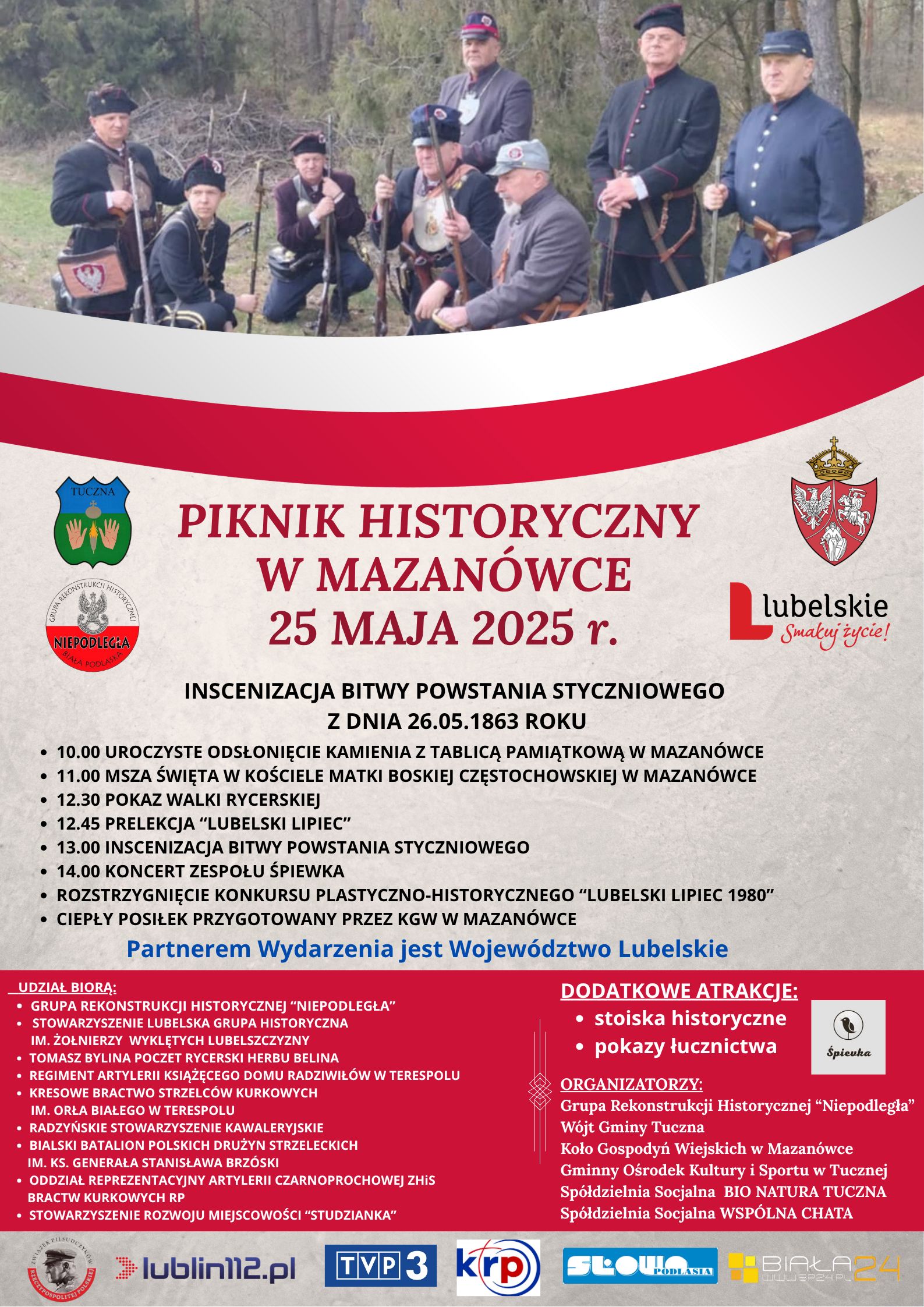 Obchody 45. rocznicy „Lubelskiego Lipca 1980” oraz Piknik Historyczny, połączony z Inscenizacją Bitwy Powstania Styczniowego z 26 maja 1863 roku – odbędą się 25 maja z Mazanówce w Gminie Tuczna. Organizatorzy chcą przybliżyć tamte wydarzenia lokalnej społeczności, pokazać bohaterstwo lokalnych mieszkańców a także zrealizować innowacyjną lekcję historii dla młodego pokolenia. Ideą całego projektu jest budowanie wspólnoty rodzinnej i międzyludzkiej, integracja lokalnych grup .