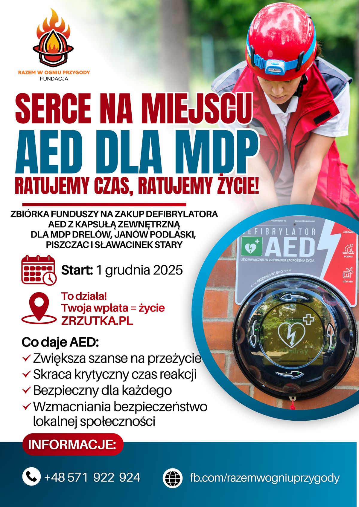 Fundacja Razem w Ogniu Przygody rozpoczęła właśnie ważną akcję społeczną pod hasłem „Serce na Miejscu – AED dla MDP”, której celem jest poprawa bezpieczeństwa mieszkańców regionu. Zbiórka publiczna ma umożliwić zakup czterech defibrylatorów AED wraz z kapsułami zewnętrznymi, które trafią do Młodzieżowych Drużyn Pożarniczych w Drelowie, Janowie Podlaskim, Sławacinku Starym oraz Piszczacu.