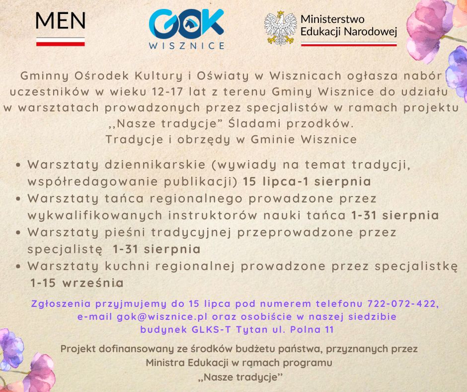 Gminny Ośrodek Kultury i Oświaty w Wisznicach rozpoczął nabór uczestników w wieku 12–17 lat do udziału w projekcie „Nasze tradycje. Śladami przodków. Tradycje i obrzędy w Gminie Wisznice”. Przedsięwzięcie realizowane jest przy wsparciu finansowym Ministerstwa Edukacji Narodowej.