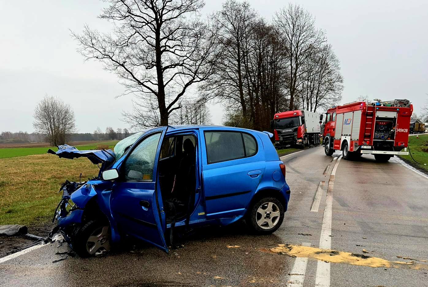 Czołowe zderzenie samochodu osobowego z ciężarówką na drodze nr 812 w rejonie Wisznic. 33-letni kierowca w ciężkim stanie trafił śmigłowcem LPR do szpitala w Lublinie.